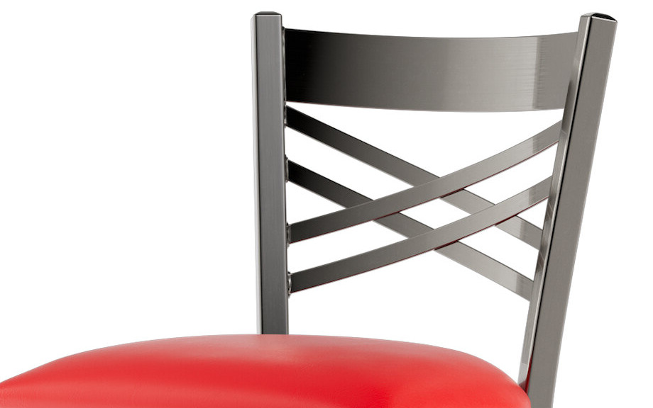 This bar stool's sleek padded seat combines with its contemporary cross back steel frame to instill a modern look in any location. Plus, since this bar stool's back is contoured for a customer's back, it will provide comfort while maintaining a distinct appearance.