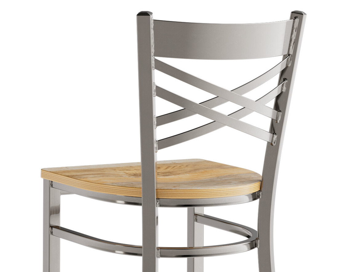 This bar stool's sturdy wood seat with a sleek driftwood finish combines with its contemporary cross back steel frame to instill a modern look in any location. Plus, since this bar stool's back is contoured for a customer's back, it will provide comfort while maintaining a distinct appearance.