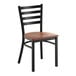 This coat steel cross back chair has a beautiful cherry wood finish that we love. Its very comfortable and our guest and staff love these chairs.