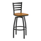 Seat your guests in comfort and style with this Lancaster Table & Seating clear coat finish ladder back swivel bar stool with vintage wood seat.
