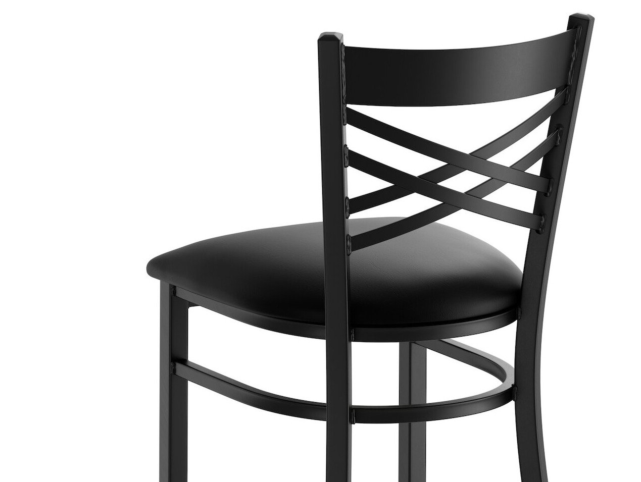 Lancaster Table & Seating Black Finish Cross Back Bar Stool with 2 1/2" Black Vinyl Padded Seat - Detached Seat