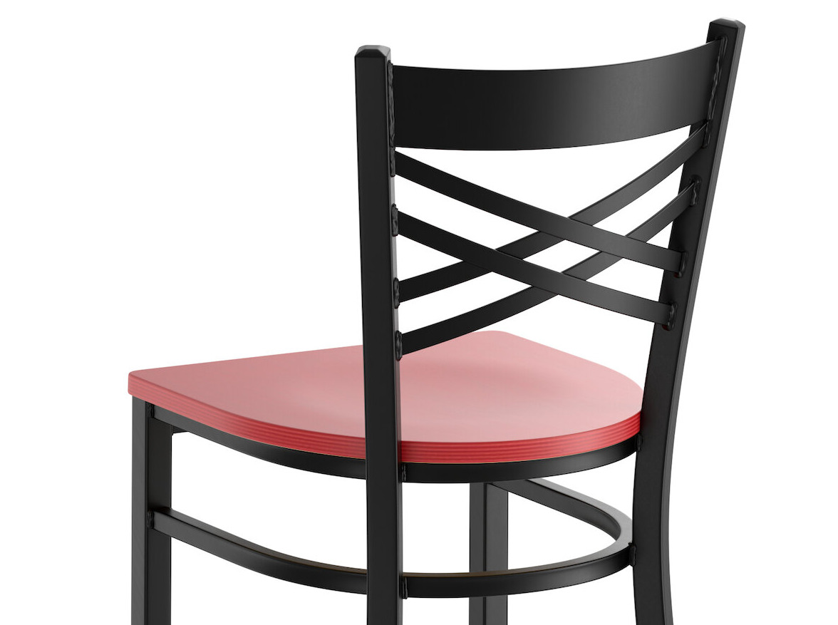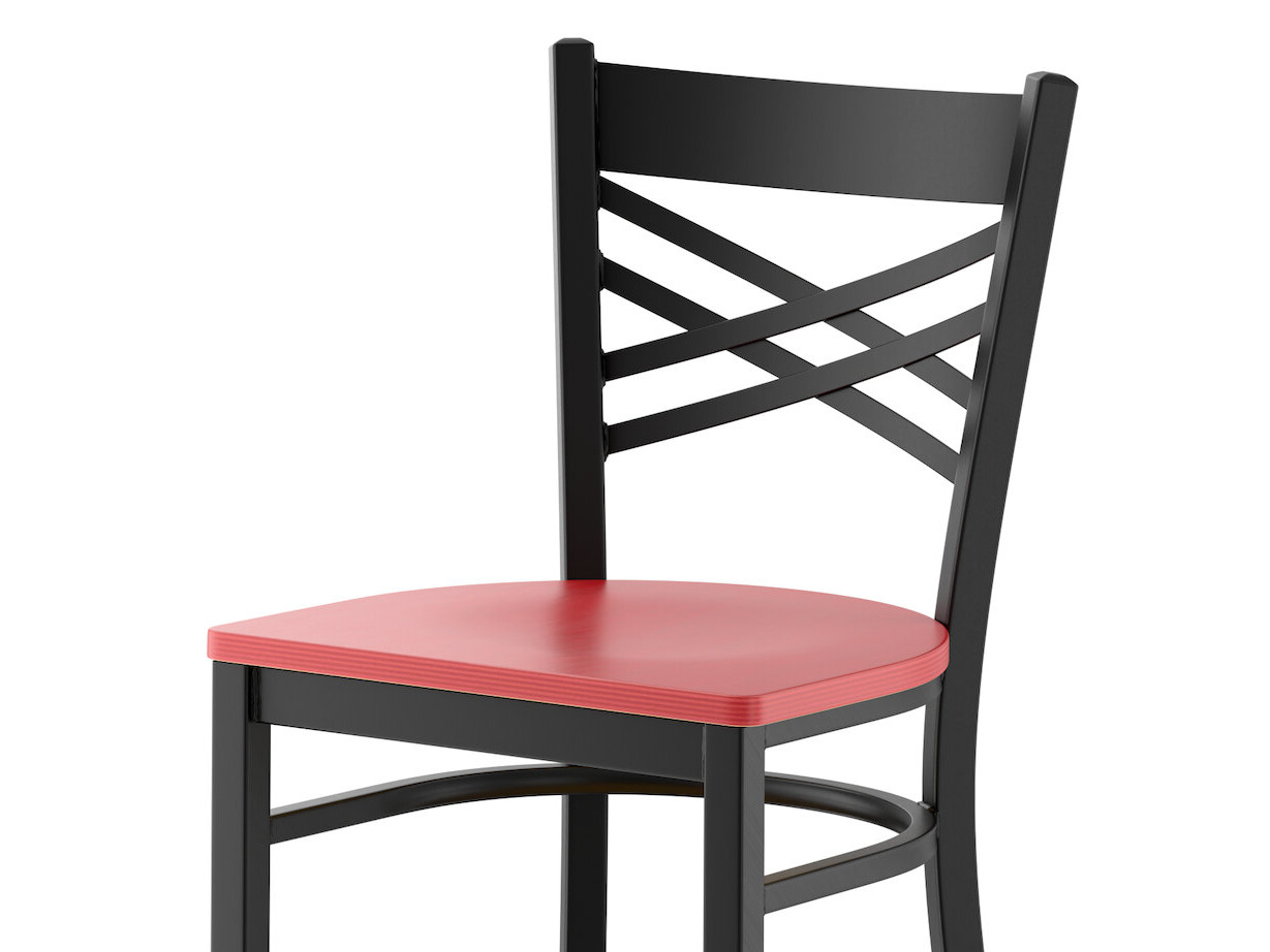 This bar stool's sturdy wood seat with a sleek mahogany finish combines with its contemporary cross back steel frame to instill a modern look in any location. Plus, since this bar stool's back is contoured for a customer's back, it will provide comfort while maintaining a distinct appearance.