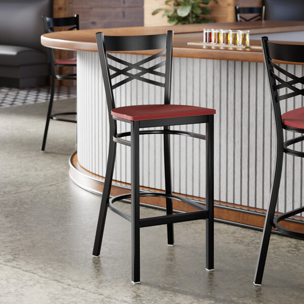 Seat your guests in comfort and style with this Lancaster Table & Seating black finish cross back bar stool with mahogany wood seat.
