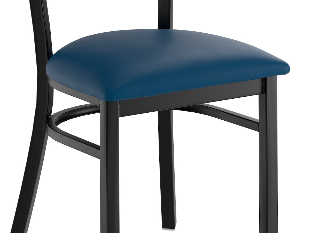 The 2 1/2" thick navy vinyl padded seat provides exceptional comfort for your guests, and it's also durable and easy to clean! It is made with fire-retardant foam for added safety.