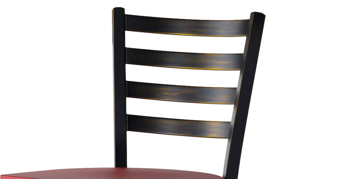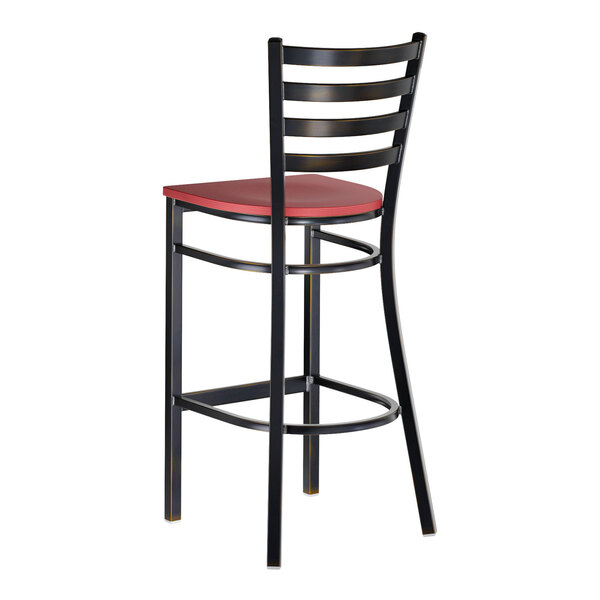 This bar stool's sturdy wood seat with a sleek mahogany finish combines with its contemporary ladder back steel frame to instill a modern look in any location. Plus, since this bar stool's back is contoured for a customer's back, it will provide comfort while maintaining a distinct appearance.
