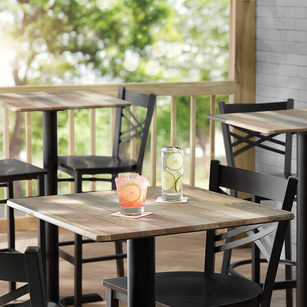 This square table top has a textured mixed plank finish that offers the rustic look of solid wood with a subtle, intriguing texture. Whether you're looking to revamp your restaurant's front-of-house space or enhance the appearance of your cafe patio or deck, this table top will spotlight the beauty of nature while focusing on an elegant dining experience in order to bring you the best of both worlds! This table top can be used with compatible Lancaster Table & Seating Excalibur table bases (sold separately). A screw length of 3/4" is recommended for installation (hardware sold separately).
