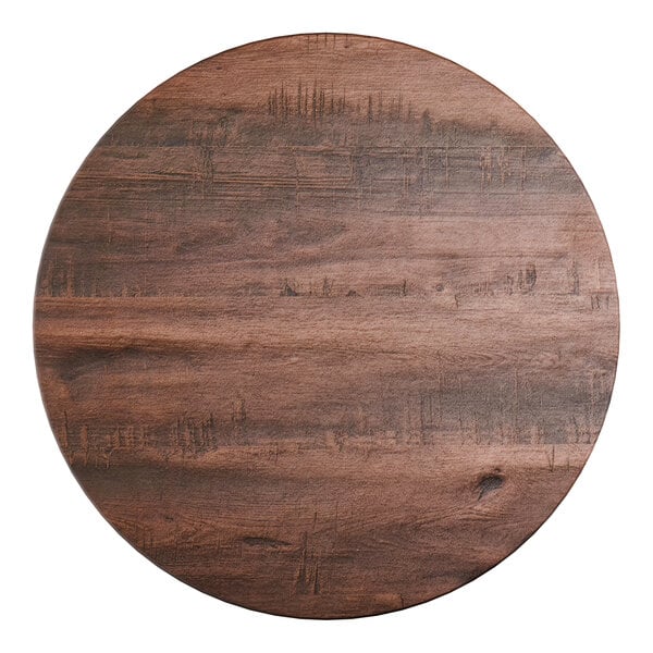 This round table top has a textured walnut finish that offers the rustic look of solid wood with a subtle, intriguing texture. Whether you're looking to revamp your restaurant's front-of-house space or enhance the appearance of your cafe patio or deck, this table top will spotlight the beauty of nature while focusing on an elegant dining experience in order to bring you the best of both worlds! This table top can be used with compatible Lancaster Table & Seating Excalibur table bases (sold separately). A screw length of 3/4" is recommended for installation (hardware sold separately).