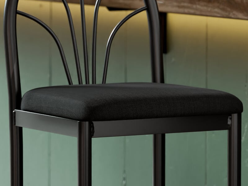 This bar stool's sturdy steel frame provides unmatched durability in your dining room. It can hold up to 250 lb. of weight thanks to the welded frame and supports under the seat. Additionally, the black powder coating on this chair ensures longevity through everyday wear and tear, resisting stains, scratches, and smudges.