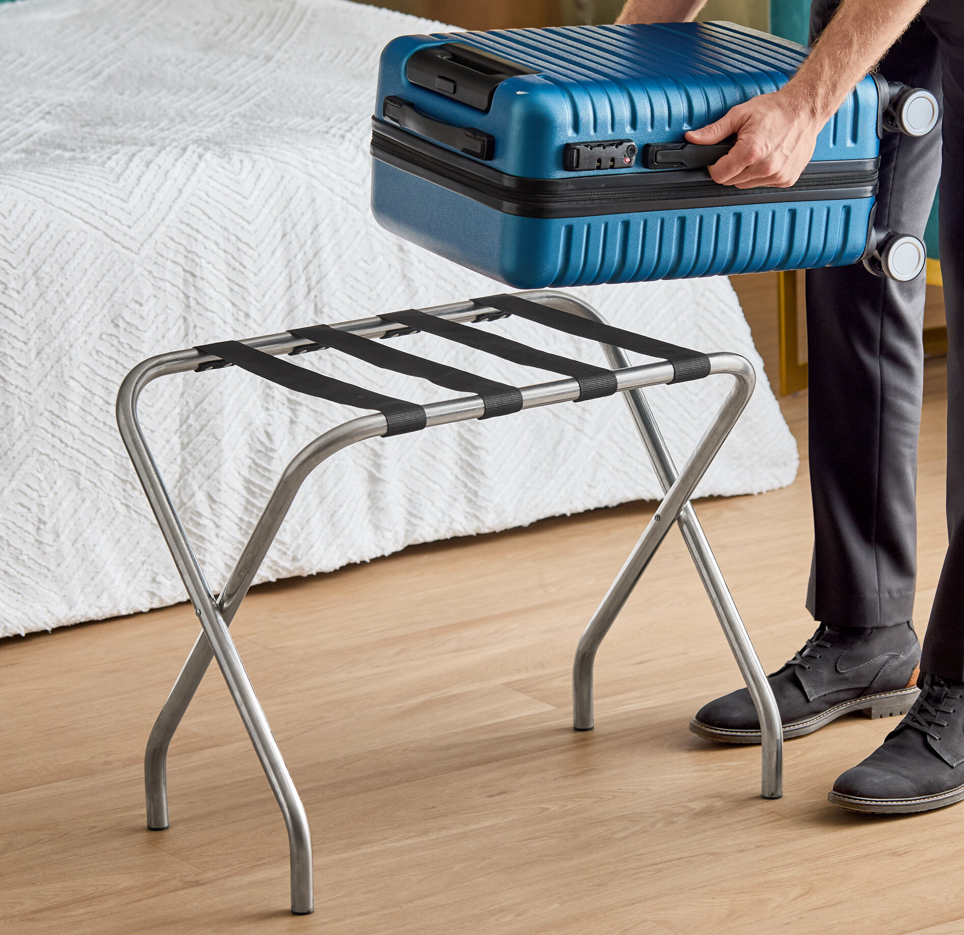 This folding luggage stand has an attractive and high-quality chrome finish that creates a modern look and matches any decor.