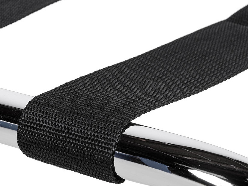 Four black fabric belts span the top of this luggage rack for additional support and stability.