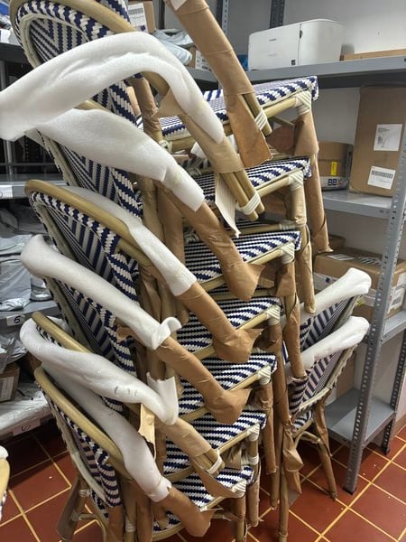 We use these Lancaster table and seating French bistro black and white outdoor chairs. Very durable and super light. We like that they are so light since we have to bring them in and out from our restaurant every day.