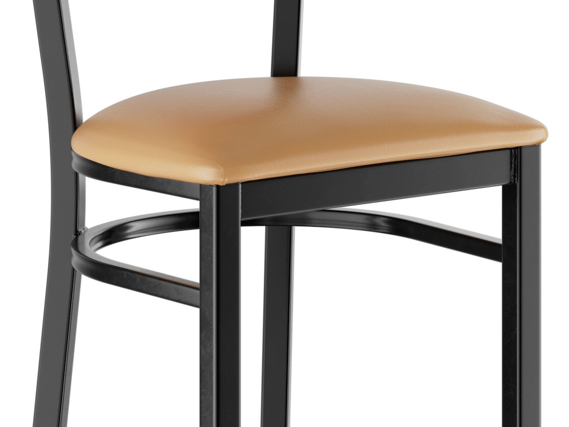 The 2 1/2" thick light brown vinyl padded seat provides exceptional comfort for your guests, and it's also durable and easy to clean! It is made with fire-retardant foam for added safety.