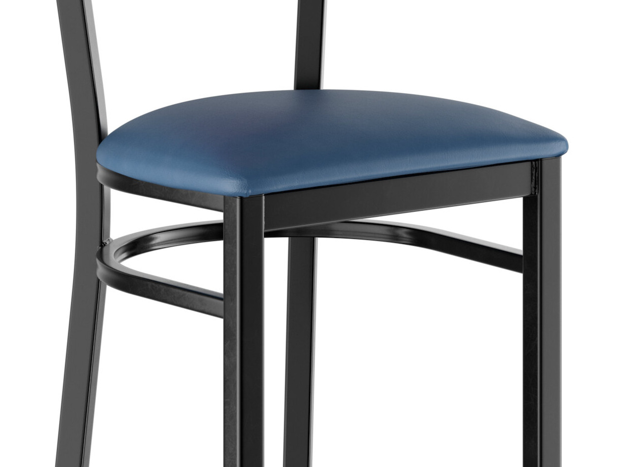 The 2 1/2" thick navy vinyl padded seat provides exceptional comfort for your guests, and it's also durable and easy to clean! It is made with fire-retardant foam for added safety.