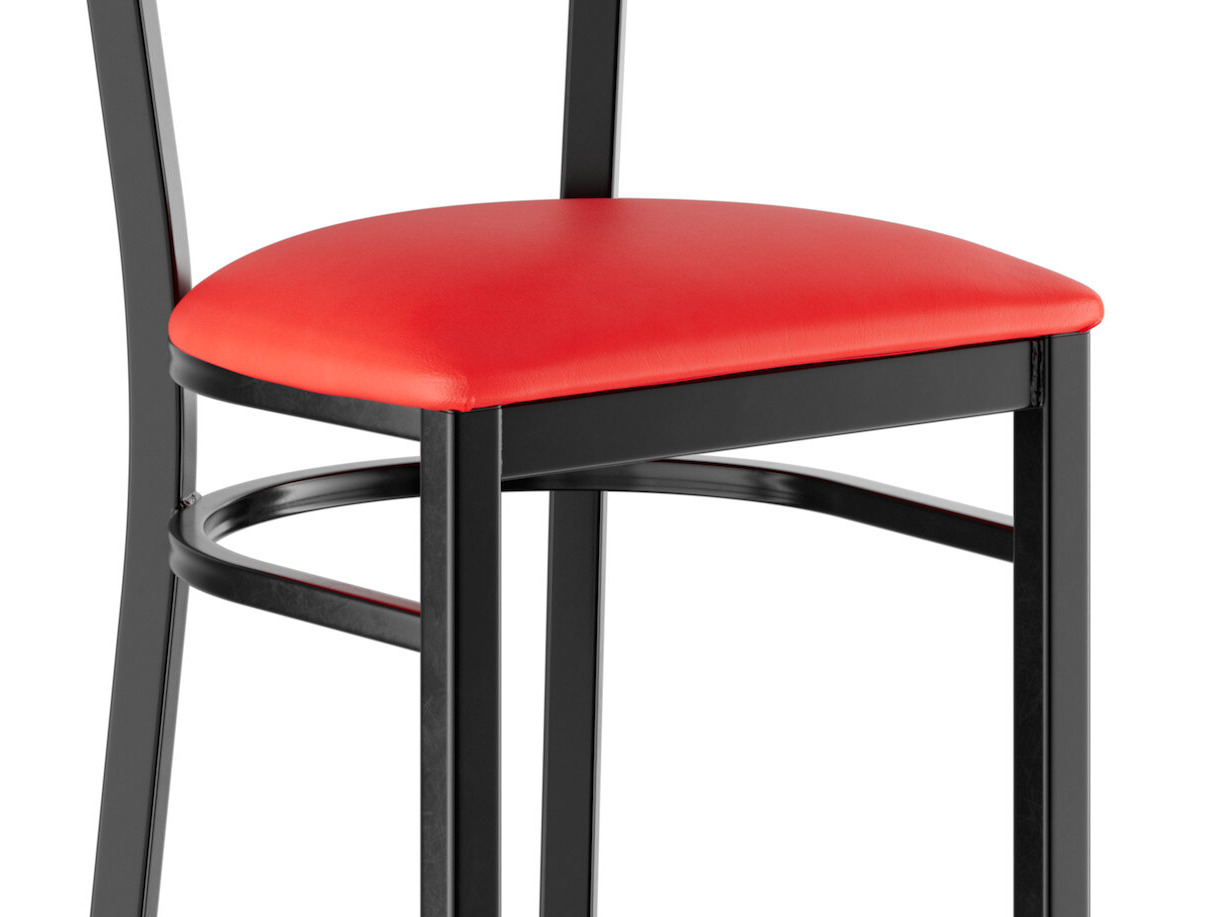 The 2 1/2" thick red vinyl padded seat provides exceptional comfort for your guests, and it's also durable and easy to clean! It is made with fire-retardant foam for added safety.