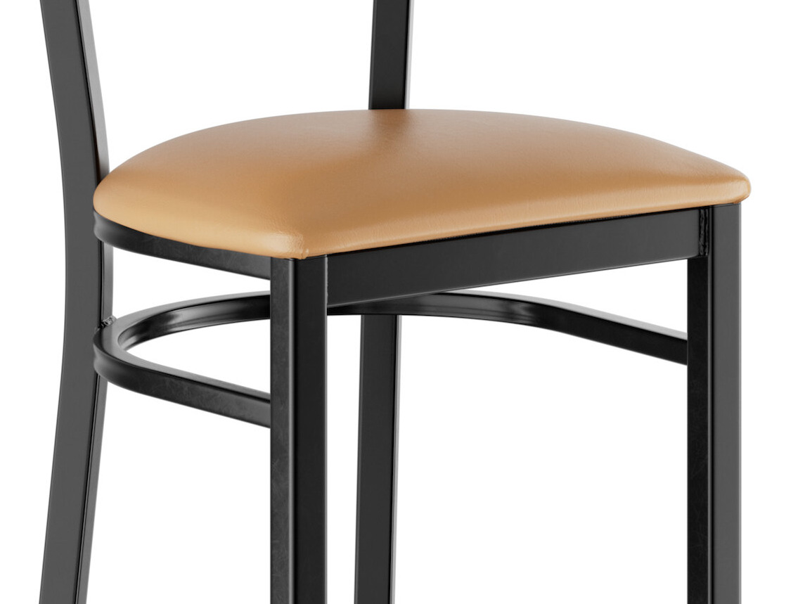 The 2 1/2" thick light brown vinyl padded seat provides exceptional comfort for your guests, and it's also durable and easy to clean! It is made with fire-retardant foam for added safety.