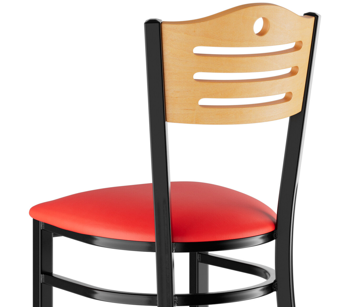 This chair features a style back with attractive slats and a cutout hole, which gives it a unique visual appeal. Plus, the chair's armless design is less restrictive and allows guests to socialize freely.