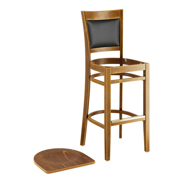This bar stool's sleek padded back and wooden seat combines with its attractive wooden frame to instill a unique look in any location. At an ideal height for both bar and raised table seating, this bar stool is a versatile option for any restaurant, bar, deli, or coffee shop.