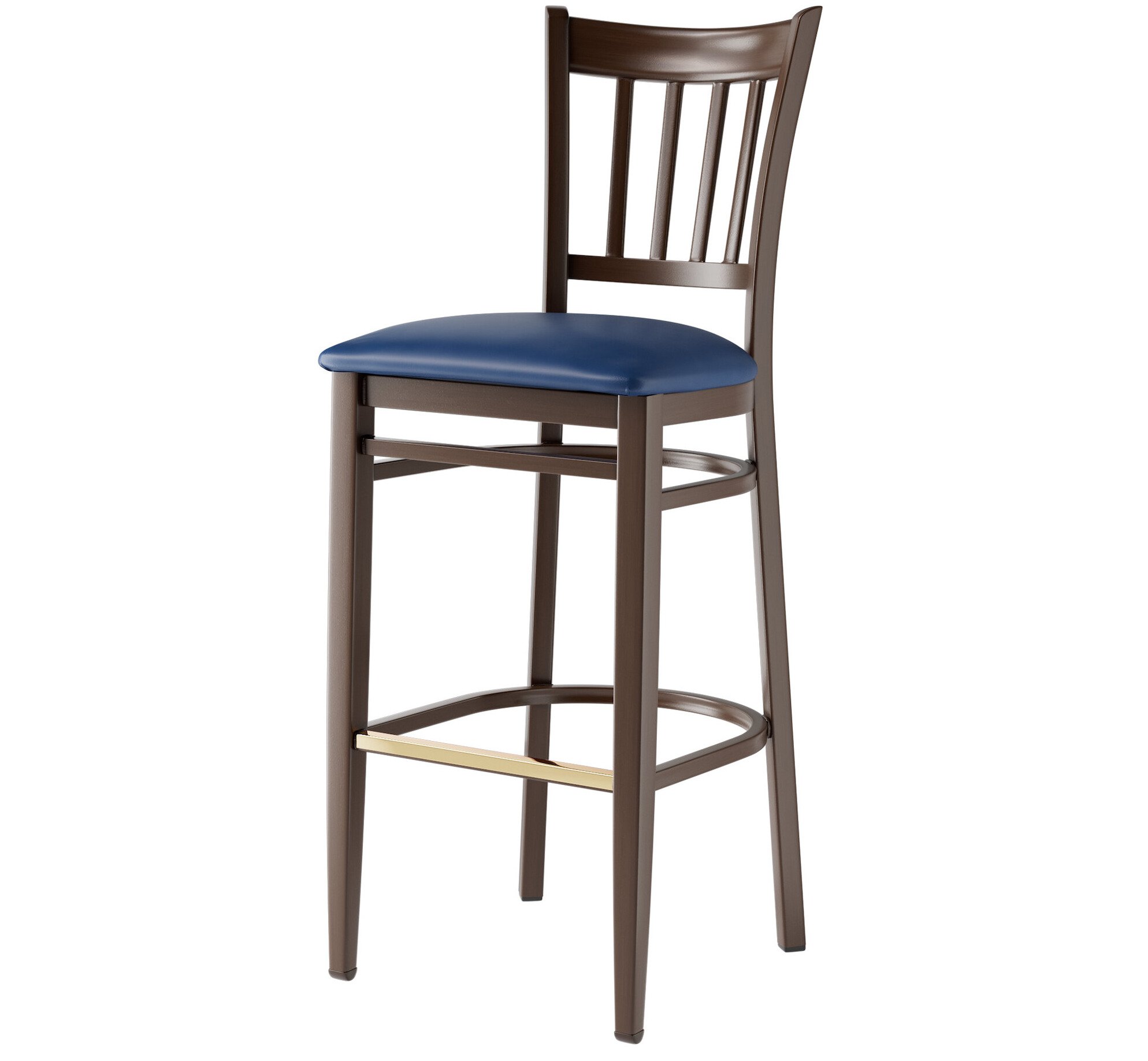 Seat your guests in comfort and style with this Lancaster Table & Seating Spartan metal slat back bar stool with dark walnut wood grain finish and 2 1/2" navy vinyl padded seat.