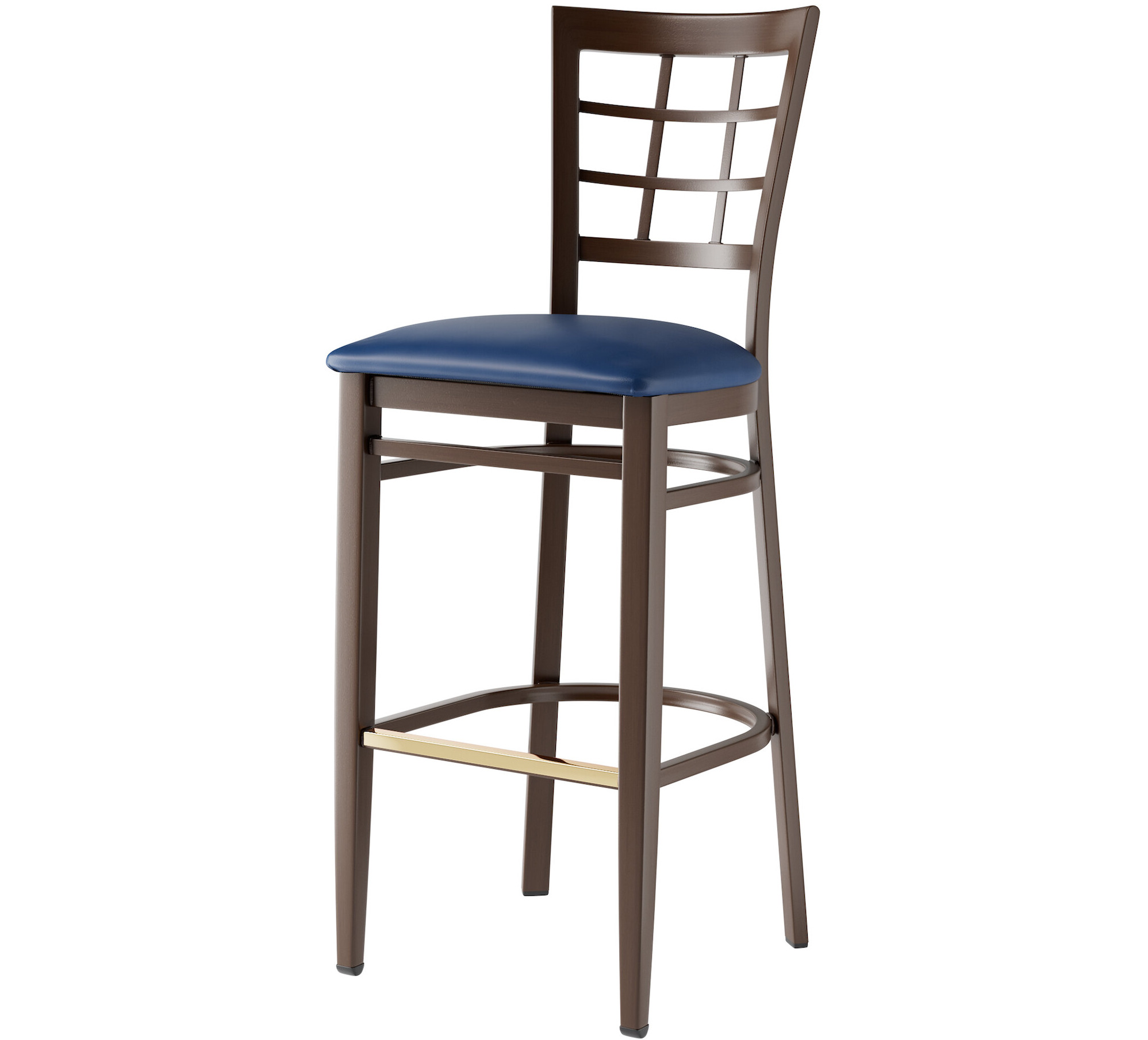 Seat your guests in comfort and style with this Lancaster Table & Seating Spartan metal window back bar stool with dark walnut wood grain finish and 2 1/2" navy vinyl padded seat.