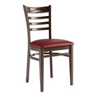 Seat your guests in comfort and style with this Lancaster Table & Seating Spartan metal ladder back chair with dark walnut wood grain finish and 2 1/2" black vinyl padded seat.