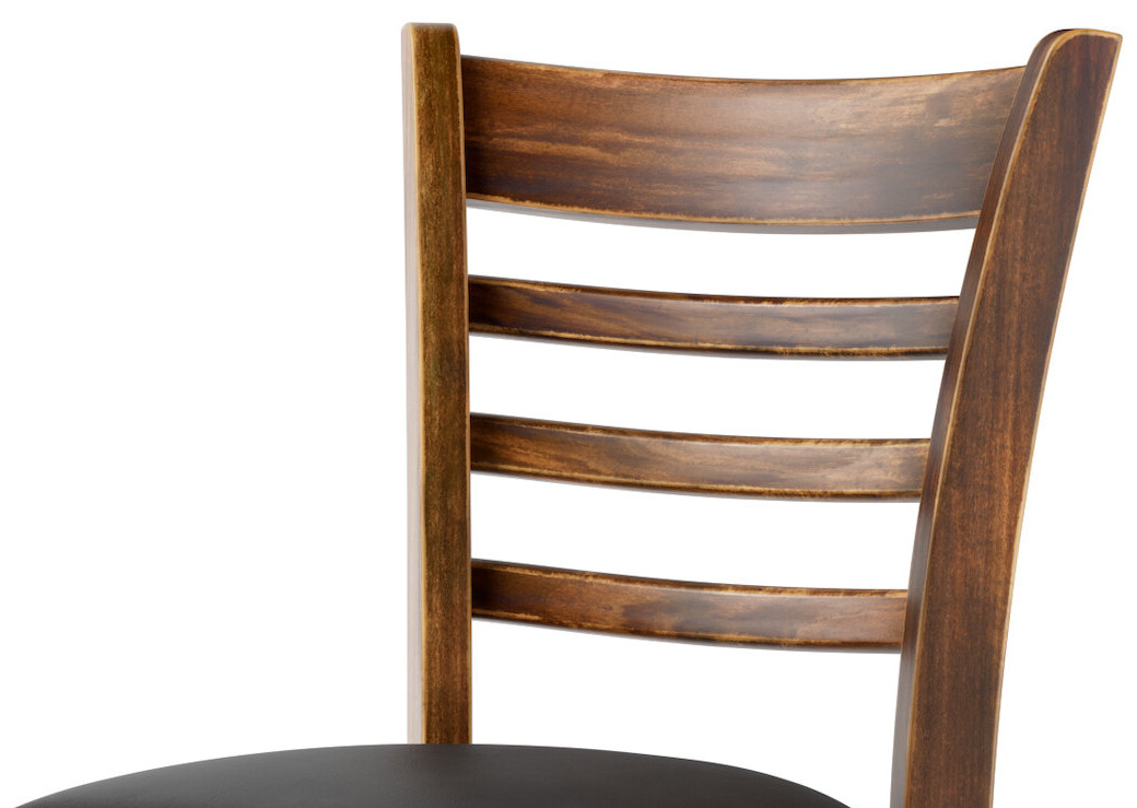 Seat your guests in comfort and style with this Lancaster Table & Seating vintage finish wood ladder back chair with black vinyl seat.