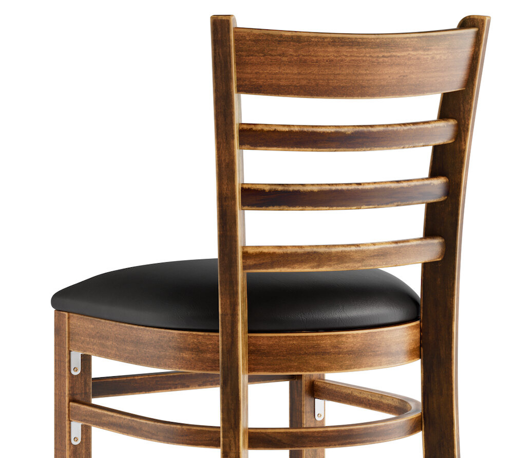 I simply love these Lancaster Table & Seating Mahogany Ladder Back Bar Height Chair with Black Padded Seat . Very well constructed and nice looking too. I love the metal plate on the front of the stool that prevents damage from stepping on it.
