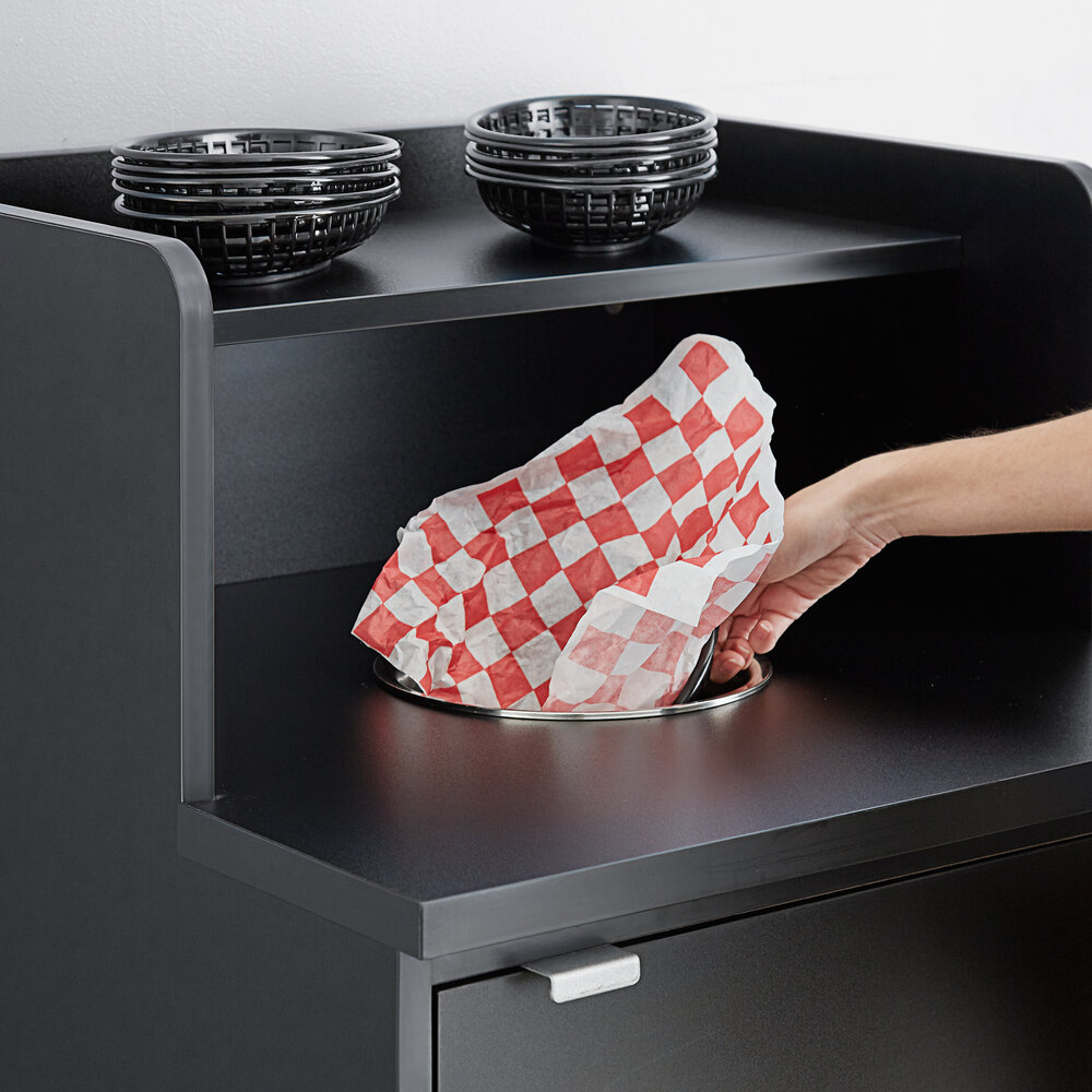 This waste bin is made out of very durable material and has a nice black finish to it. It looks perfect with the color scheme of my store. It actually looks a lot nicer than the ones you see at most fast food establishments. The shelf for trays are perfect so customers can dispose of their garbage and leave the tray right above.
