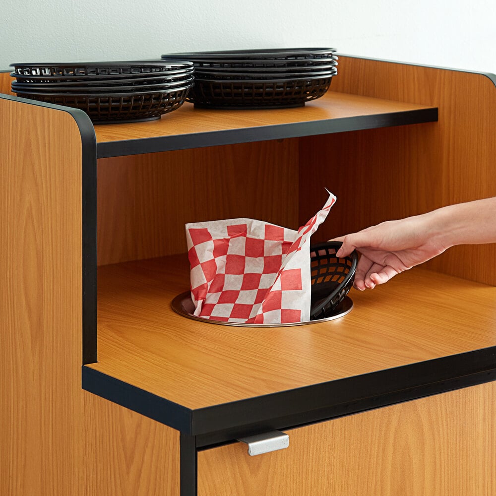 This waste bin is made out of very durable material and has a nice black finish to it. It looks perfect with the color scheme of my store. It actually looks a lot nicer than the ones you see at most fast food establishments. The shelf for trays are perfect so customers can dispose of their garbage and leave the tray right above.