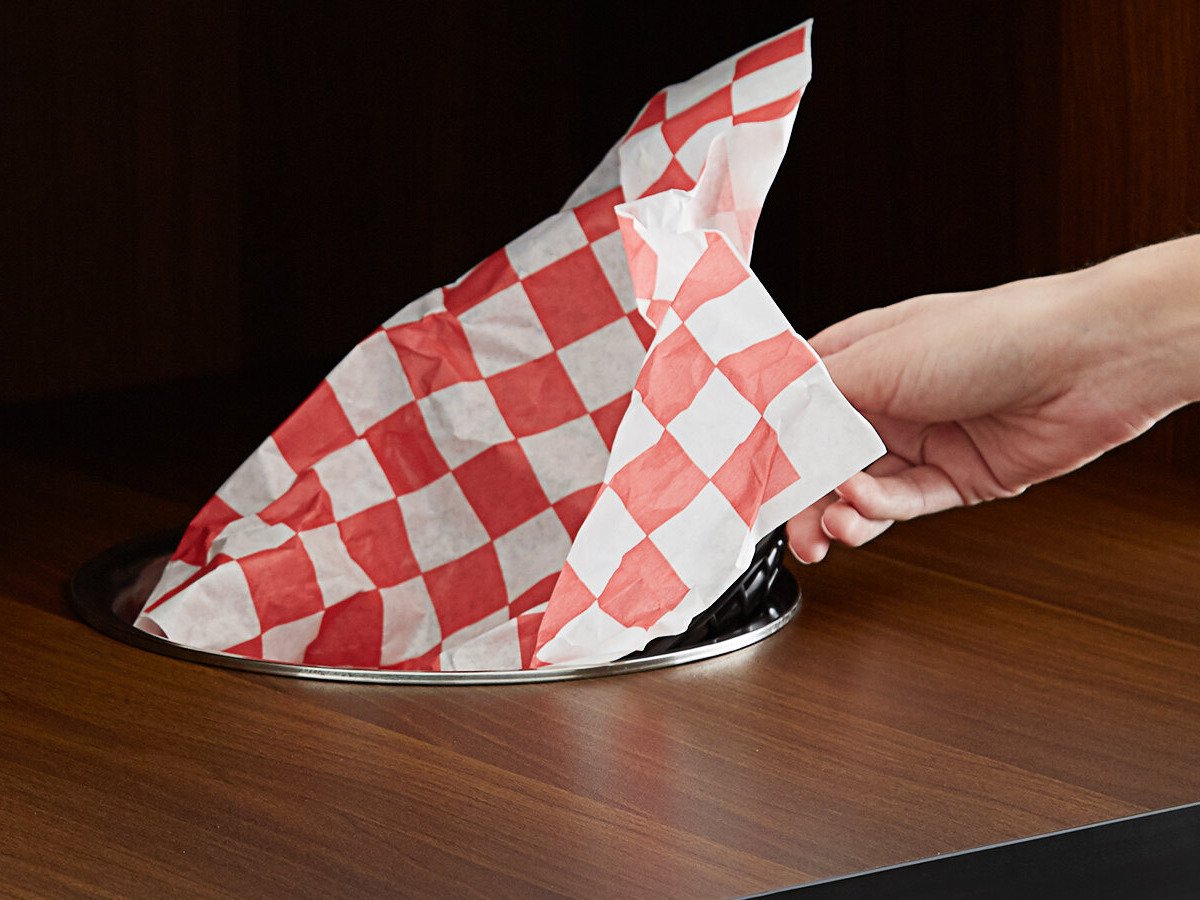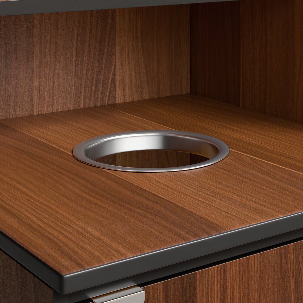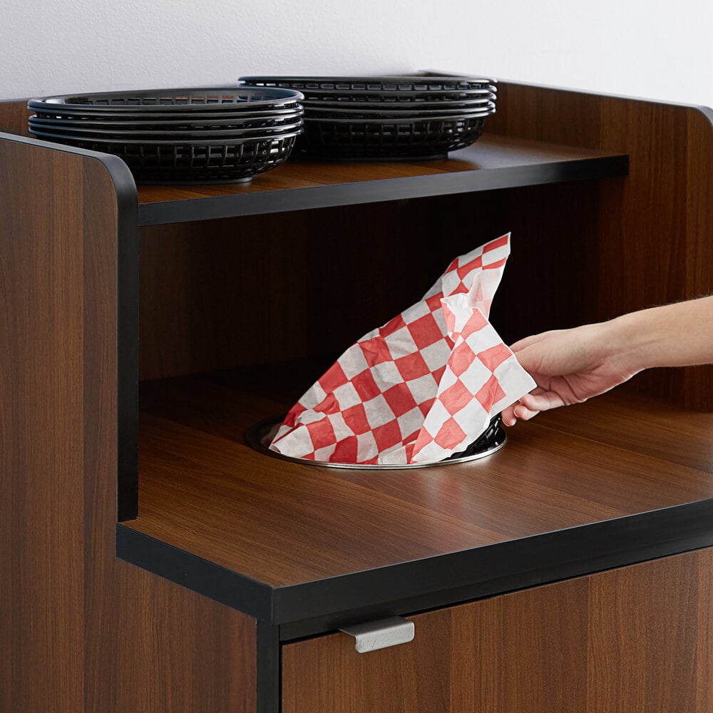 This waste bin is made out of very durable material and has a nice black finish to it. It looks perfect with the color scheme of my store. It actually looks a lot nicer than the ones you see at most fast food establishments. The shelf for trays are perfect so customers can dispose of their garbage and leave the tray right above.