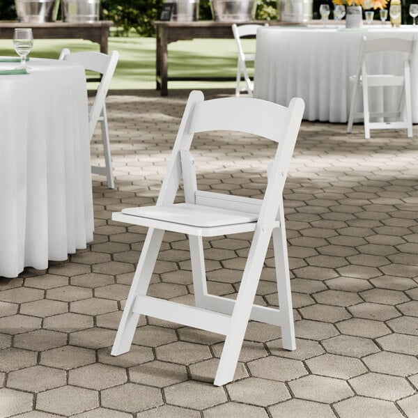 This model's white resin finish adds style and class to any backyard barbeque, formal banquet, or wedding. Guests will feel comfortable for hours, thanks to the chair's vinyl padded seat. Plus, its durable polypropylene design ensures it can stand up to both indoor and outdoor use for added versatility, making it ideal for your business.