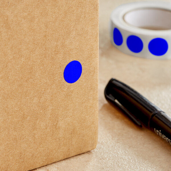 This label is easy to write on thanks to its blank design. Made with a 1 1/2" core diameter and pressure-sensitive paper with permanent adhesive, this item can be confidently placed on trays, plastic containers, boxes, and folders. The label's 1/2" diameter is the perfect size to mark inventory or create charts and visual aids.