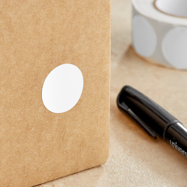 This label is easy to write on thanks to its blank design. Made with a 1 1/2" core diameter and pressure-sensitive paper with permanent adhesive, this item can be confidently placed on trays, plastic containers, boxes, and folders. The label's 1" diameter is the perfect size to mark inventory or create charts and visual aids.