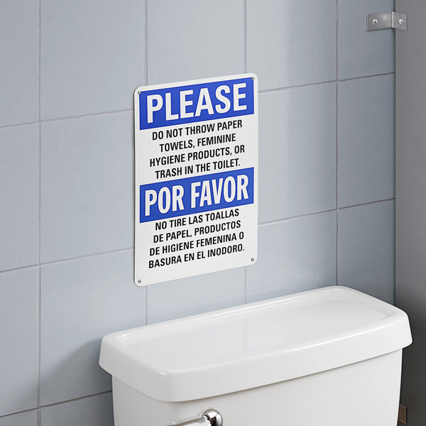 Promote proper disposal in your commercial restroom with this Lavex non-reflective plastic bilingual safety sign. This sign reinforces that paper towels, feminine hygiene products, and trash should not be disposed of in toilets. Designed for enhanced visibility, its vivid blue, black, and white color contrast helps to draw attention to the message, while the bold "Please Do Not Throw Paper Towels, Feminine Hygiene Products, Or Trash In The Toilet" text in English and Spanish allows for easy readability and comprehension. This sign also features rounded corners that eliminate sharp edges while offering a sleek, professional look.