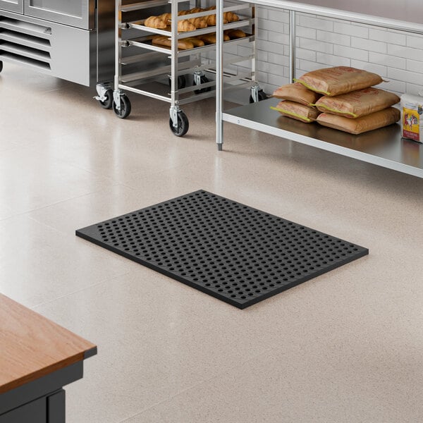 Create optimum workplace safety with this Lavex 2 7/16' x 3 1/4' heavy-duty black rubber straight edge anti-fatigue diamond floor mat. For general, heavy-duty use in non-grease areas, this versatile mat is great for washing stations, prep areas, bars, and workshops. It also features a solid construction of nitrile-blend rubber, making it a durable safety solution that provides excellent resistance to water, heat, chemicals, and physical abrasion. Plus, its 7/8" thickness provides plenty of additional support. With a continuous hole design, this mat allows liquids and debris to properly drain from ramp and floor surfaces.