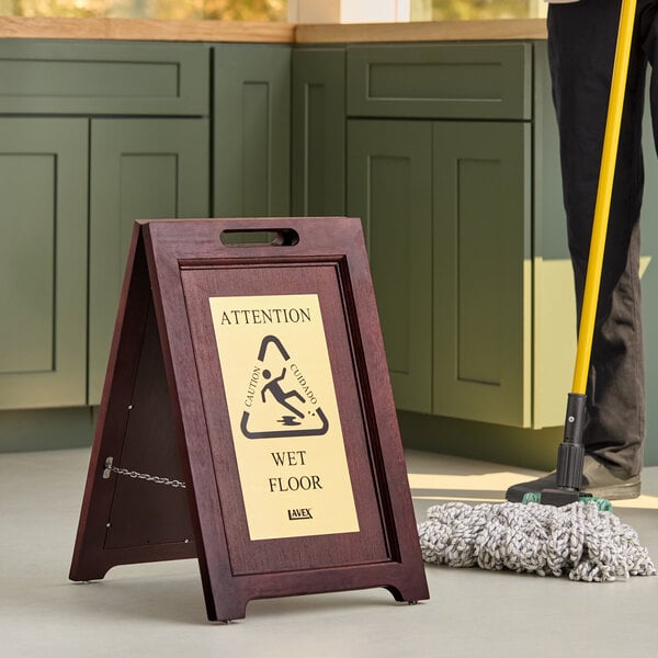 Lavex 24" Wooden A-Frame Wet Floor Sign with Brass-Coated Stainless Steel Plates