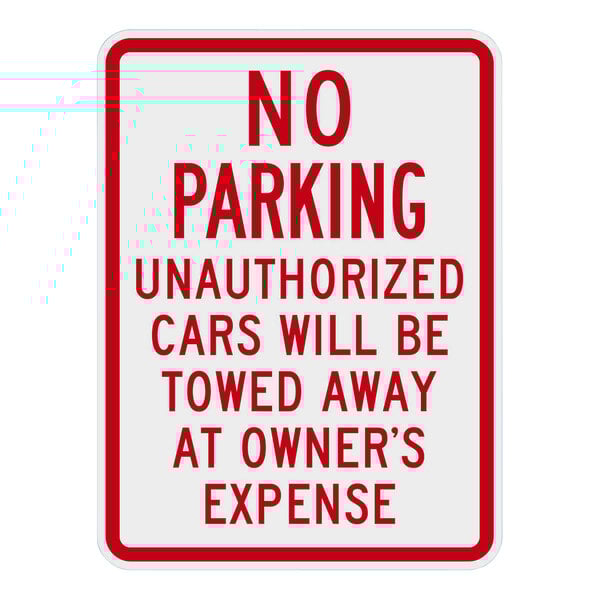 Clearly mark off areas where parking is not allowed with this Lavex safety sign. This highly visible sign clearly indicates where customers cannot park, warning them of the consequences if they choose to ignore the restriction. Its eye-catching design features "No Parking / Unauthorized Cars Will Be Towed Away At Owner's Expense" in bold red text against a bright white background, ensuring that it is easily visible, even from a distance. Ideal for use in parking lots, garages, and other areas where parking restrictions need to be clearly communicated, it helps maintain order and ensures compliance with parking regulations. Its 24" x 18" size is perfect for being seen without becoming an obstruction, and the rounded corners not only enhance its professional look but also ensure safety by eliminating sharp edges.