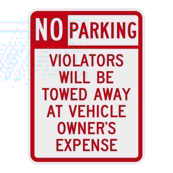Clearly mark off areas where parking is not allowed with this Lavex safety sign. Built for enhanced visibility, this sign indicates where customers cannot park, warning them of the consequences if they choose to ignore the restriction. While its red and white color contrast helps to draw attention, its bold "No Parking / Violators Will Be Towed Away At Vehicle Owner's Expense" text allows for easy readability and comprehension. Plus, it features rounded corners for added safety and a sleek, professional look. It also has a maximum external temperature of 180 degrees Fahrenheit.
