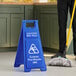 Put safety first with this Lavex wet floor sign! This safety sign features blue polypropylene construction, it's light weight, and it's designed for maximum visibility. The sign's A-frame style offers a quick, easy setup wherever floors are wet, and it collapses for out-of-the-way storage when not in use. A handle at the top of the sign makes it easy to carry the sign by hand or on your janitor's cart for added convenience.