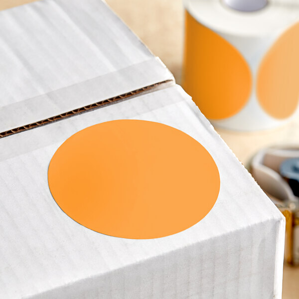 This label is easy to write on thanks to its blank design. Made with a 1 1/2" core diameter and pressure-sensitive paper with permanent adhesive, this item can be confidently placed on trays, plastic containers, boxes, and folders. The label's 4" diameter is the perfect size to mark inventory or create charts and visual aids.