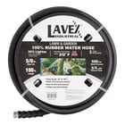 Equip your establishment with this sturdy Lavex 100' 5/8" contractor grade black rubber water hose with 3/4" GHT connection - 500 PSI. Constructed entirely from ultra-durable rubber and complete with brass fittings, this hose is sure to withstand the wear and tear of constant use in commercial establishments. It is designed to be 20% lighter than standard rubber water hoses, allowing you to transport and handle this product with ease. When put under pressure, this unit is designed to remain kink-free for uninterrupted water flow as you work, continuously producing water. This hose can withstand water temperatures of up to 212 degrees Fahrenheit. This high-temperature capacity allows it to withstand a washdown environment. Additionally, the 4-finger grip bend restrictor allows you to maintain a firm, comfortable hold on the hose for ultimate control.