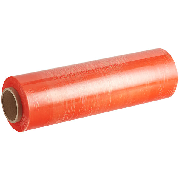 Trust this 18" x 1500' 80-gauge orange tint stretch wrap / hand film to wrap your product safely and securely!
