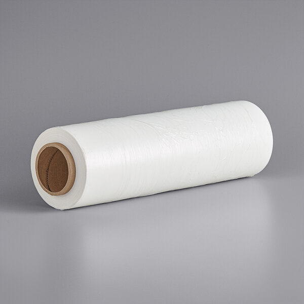Trust this 18" x 1500' 80-gauge white tint stretch wrap / hand film to wrap your product safely and securely!