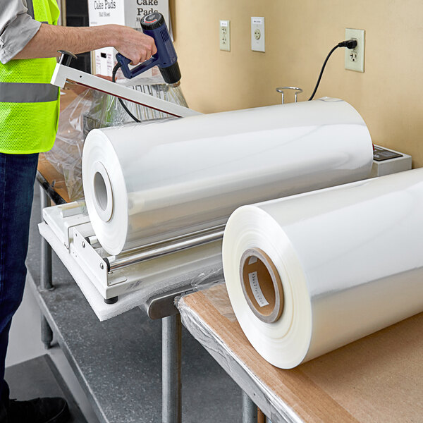 Wrap your packages with a strong and aesthetically pleasing shrink wrap using this Lavex Pro 20" x 3,500' 75 gauge polyolefin cross-linked perforated shrink film.
