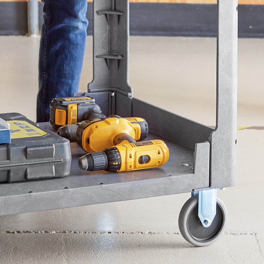 Thanks to the cart's 2 spacious shelves, this item can also accommodate up to 550 lb. of evenly distributed weight. The large, flat-top shelf is even ideal for oversized loads and doubles as a smart, convenient work surface. Plus, it includes a built-in tool compartment for keeping small parts close at hand and a cord holder for wire management.