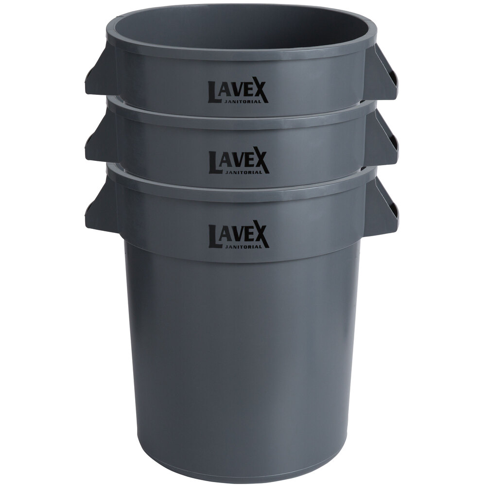 This Lavex gray trash can is essential for a variety of tasks, including proper trash storage and removal. The gray coloring helps this trash can stand out and it's great for creating a color-coded system in your kitchen to prevent cross-contamination. Regardless of whether you need a recycling can, trash can, or large bulk storage container, this can is sure to do the job! This can boasts NSF standard 2, meaning it meets the minimum food protection and sanitation requirements for materials, design, fabrication, construction, and performance of food handling and processing equipment in bakeries, cafeterias, kitchens, and pantry units. The twist-on dolly style has a 250 lb. weight limit and is simple to use. It also extends the overall life of the can by not dragging it on the ground.