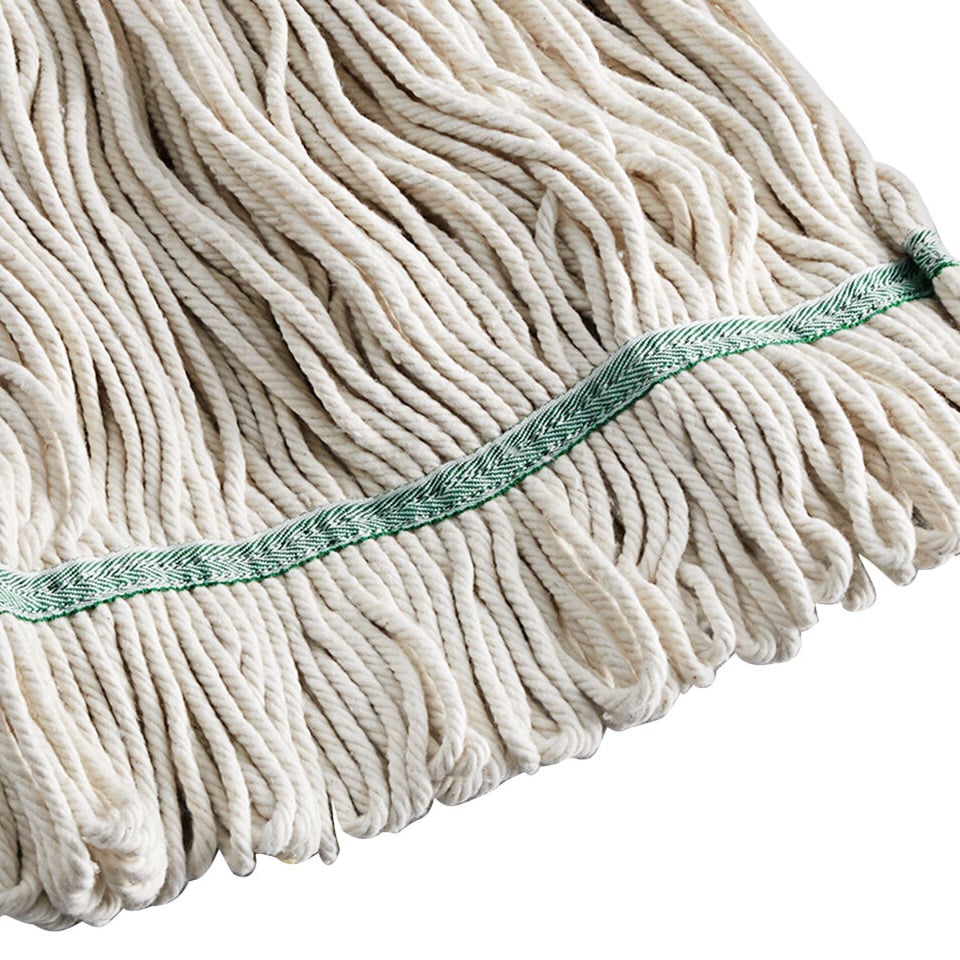 This mop head readily collects dirt and grime to maintain sanitary conditions in your restaurant, hotel, or office. The mop's cotton construction makes it very durable, so it can handle heavy-duty messes in your facilities. This cotton mop head is an economical and efficient choice for keeping your establishment in pristine condition. Choose this cotton mop with a classic look for a trustworthy and hassle-free way to keep your facility clean! The 1" band is ideal for use with quick release mop handles.