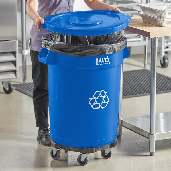 Manage waste and keep your space clean with this Lavex 32 gallon blue round commercial recycling can with blue lid and dolly!