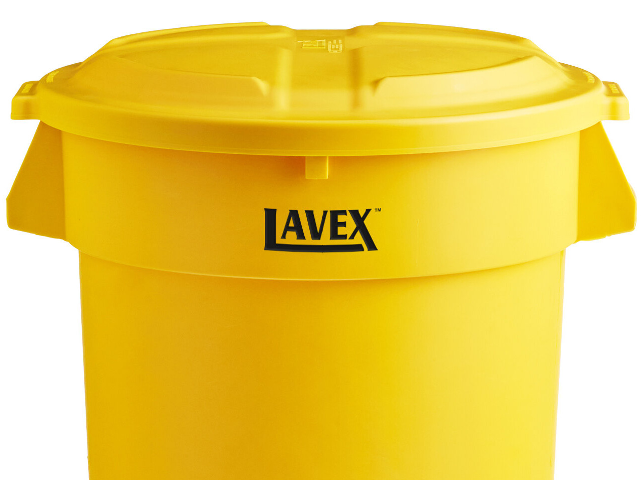 This Lavex trash can is essential for a variety of tasks, including proper trash storage and removal. The yellow coloring helps this trash can stand out, and it's great for creating a color-coded system in your kitchen to prevent cross-contamination. Regardless of whether you need a recycling can, trash can, or large bulk storage container, this can is sure to do the job! This can boasts NSF standard 21, meaning it meets the minimum sanitation requirements for materials, design, and construction of new thermoplastic refuse containers intended for indoor and outdoor refuse storage.