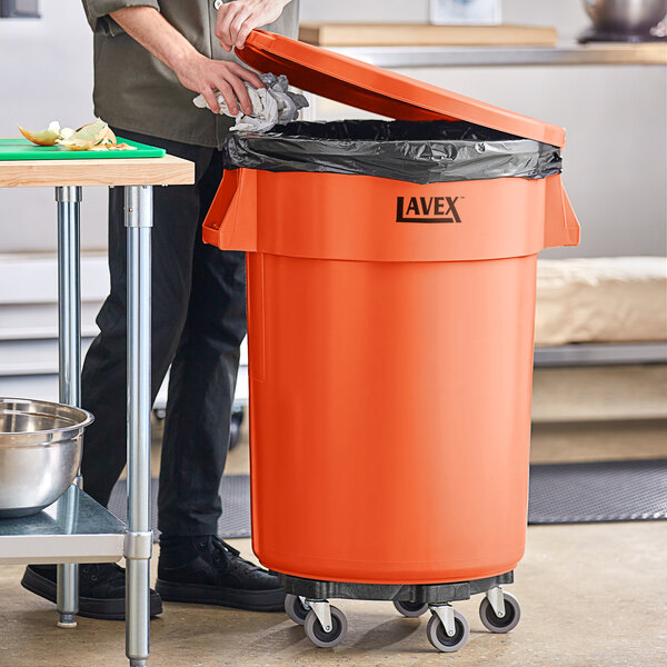This Lavex orange trash can is essential for a variety of tasks, including proper trash storage and removal. The orange coloring helps this trash can stand out and it's great for creating a color-coded system in your kitchen to prevent cross-contamination. Regardless of whether you need a recycling can, trash can, or large bulk storage container, this can is sure to do the job! This can boasts NSF standard 21, meaning it meets the minimum sanitation requirements for materials, design, and construction of new thermoplastic refuse containers intended for indoor and outdoor refuse storage. The twist-on dolly style has a 250 lb. weight limit and is simple to use. It also extends the overall life of the can by not dragging it on the ground.