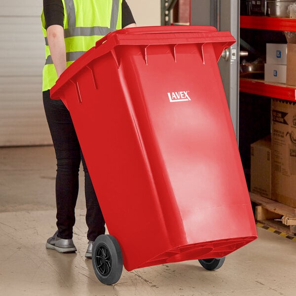 Increase the efficiency of your waste removal operation with this Lavex 95 gallon red wheeled rectangular trash can with lid.